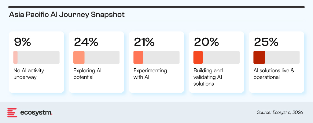 It is in this value creation that the biggest hurdle becomes visible. Across Asia Pacific, organisations are actively experimenting with or deploying newer AI capabilities.